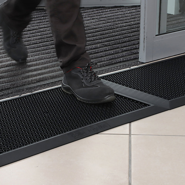 Tapis pédiluve souple pour la désinfection des chaussures du personnel en entreprise.